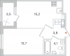 - Площади: общая: 38,55м2 , жилая: 13.7 м2 , кухни: 15.2 м2