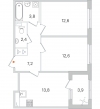 - Площади: общая: 54,35м2 , жилая: 25.2 м2 , кухни: 13.8 м2